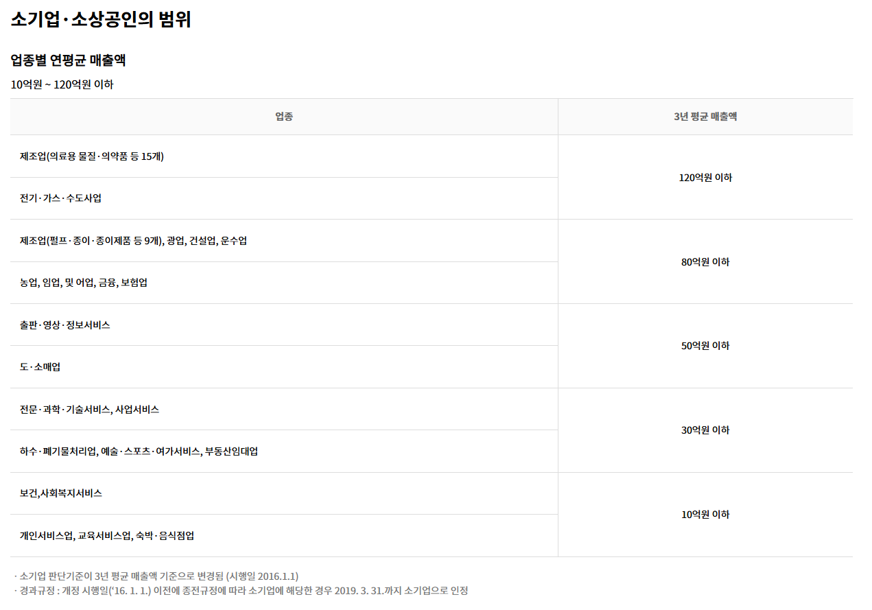 참고로 '소기업·소상공인'의 기준은 업종별로 연평균 매출액에 따라 다르게 적용됩니다