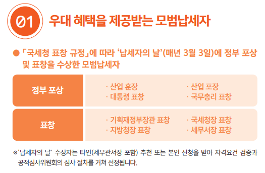 | 공영주차장 및 국립공원 주차장 무료 이용 | 선정일부터 1년간 | 국세청장 표창 이상 수상자 대상 |