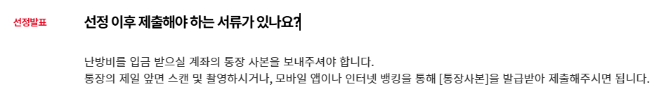 - 선정 이후에는 입금받을 계좌 통장 사본을 제출해야 하며, 통장 앞면 사진 또는 인터넷 뱅킹 발급자료로도 인정됩니다.
