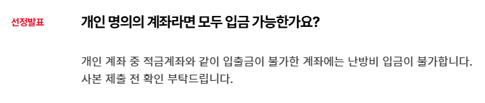 | 개인 | 50만 원 | 10월 27일 ~ 11월 23일 | 12월 11일 | 12월 23일 |