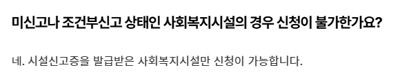 - 미신고·조건부 신고 상태의 사회복지시설은 신청이 불가합니다.