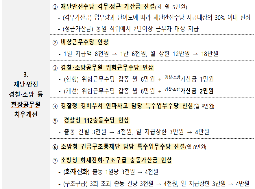 재난·안전, 경찰·소방 공무원 수당이 인상됩니다. 위험근무수당과 출동 가산금 상한액도 확대됩니다.