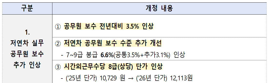 전체 보수는 3.5% 인상되며, 7~9급 저연차 초임은 6.6% 오릅니다.